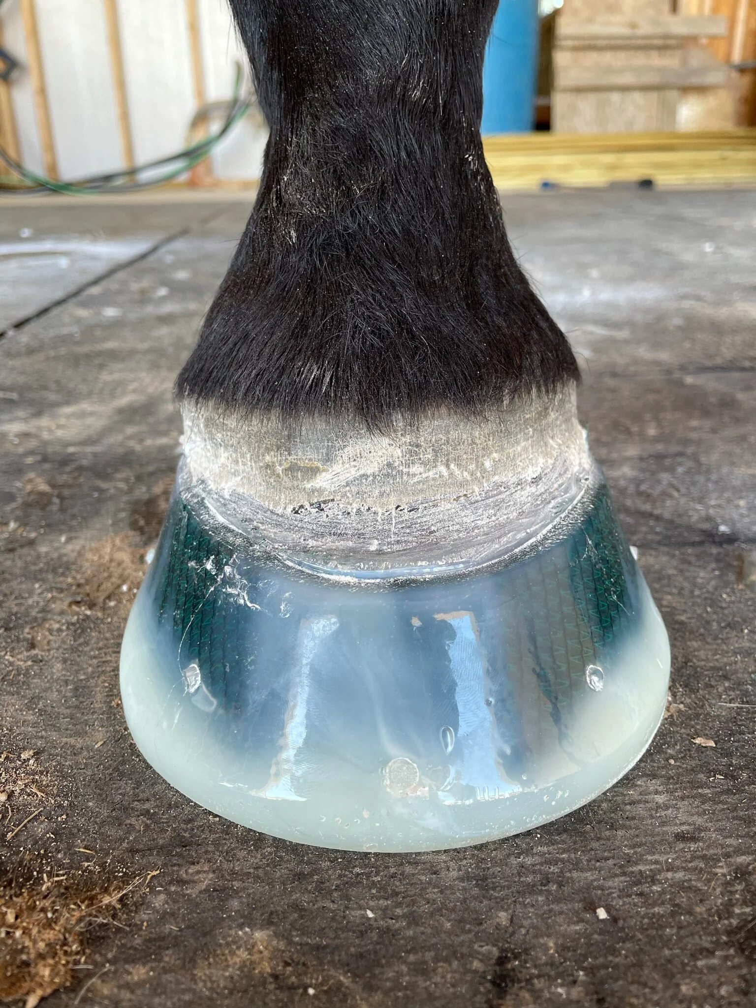 Formahoof is a polyurethane liquid fit, non-invasive, 3D protective support system. Which is a fancy way of saying it is like a prosthetic for the horses hoof. It is designed to operate just like a healthy hoof does! It flexes and expands like the hoof does while providing protection and facilitating comfortable movement and better circulation which creates an environment for accelerated growth. Because of this most lame horses experience instant pain relief after application.
